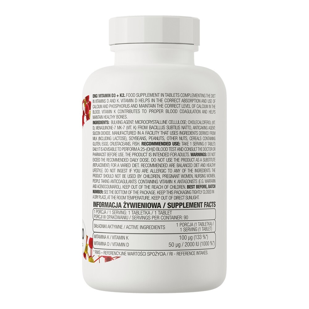 • Vitamina K2 (MK-7) este esențială pentru buna funcționare a organismului, reglează procesul de coagulare a sângelui și, de asemenea, afectează menținerea densității minerale osoase normale.Vitamina K2 este responsabila pentru transportul corect al calciului de la sânge la țesutul osos, ceea ce permite menținerea oaselor sănătoase și puternice și crește rezistența acestora.
